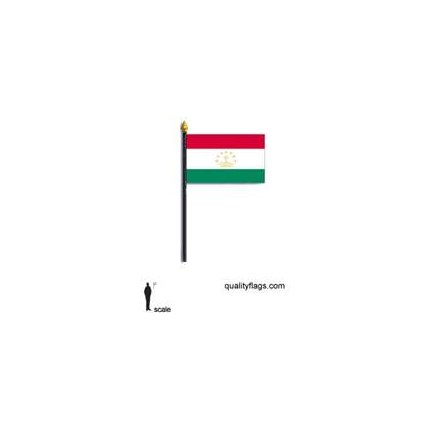 This 4 x 6 inch Tajikistan Flag is printed on lustrous, silk-like polyester material. Each one is carefully hem-stitched on all four sides for longer lasting beauty. Mounted on a 10 inch black plastic staff, this flag offers the highest quality in a mounted flag. This product is made of a material not suitable for outdoor use.